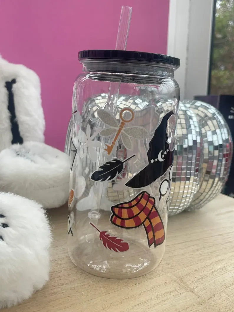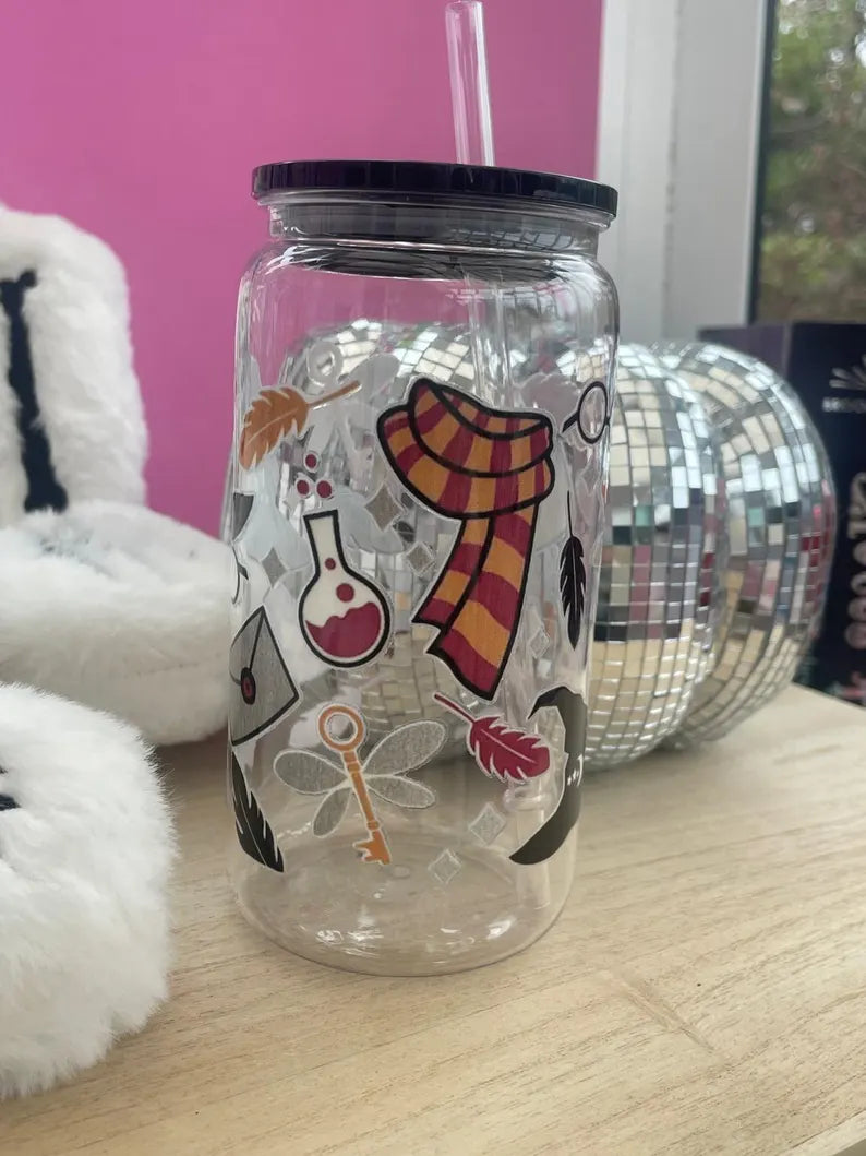 Harry Potter designed plastic can glasses with lid and straw. Perfect for the lead up to Christmas .