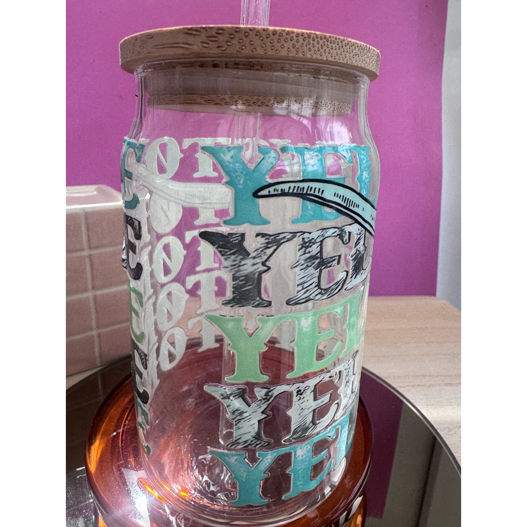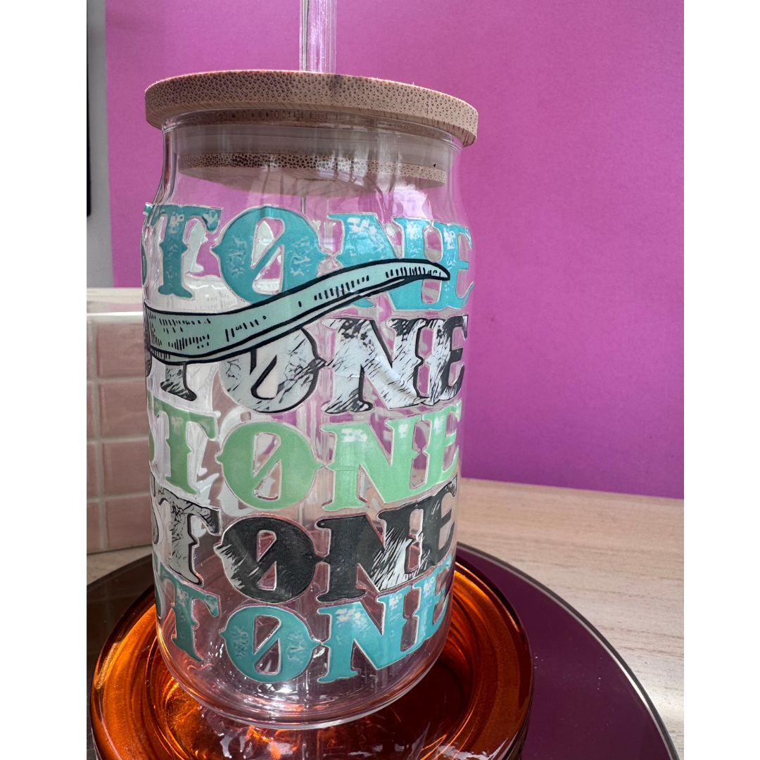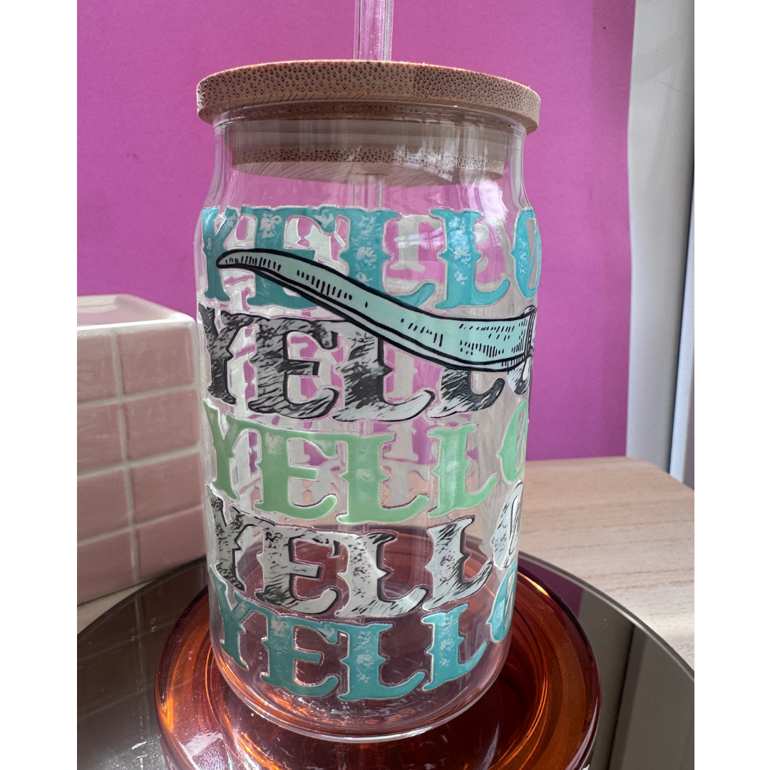 Yellowstone design can glasses with wooden lid and glass straw. Perfect for any country lovers
